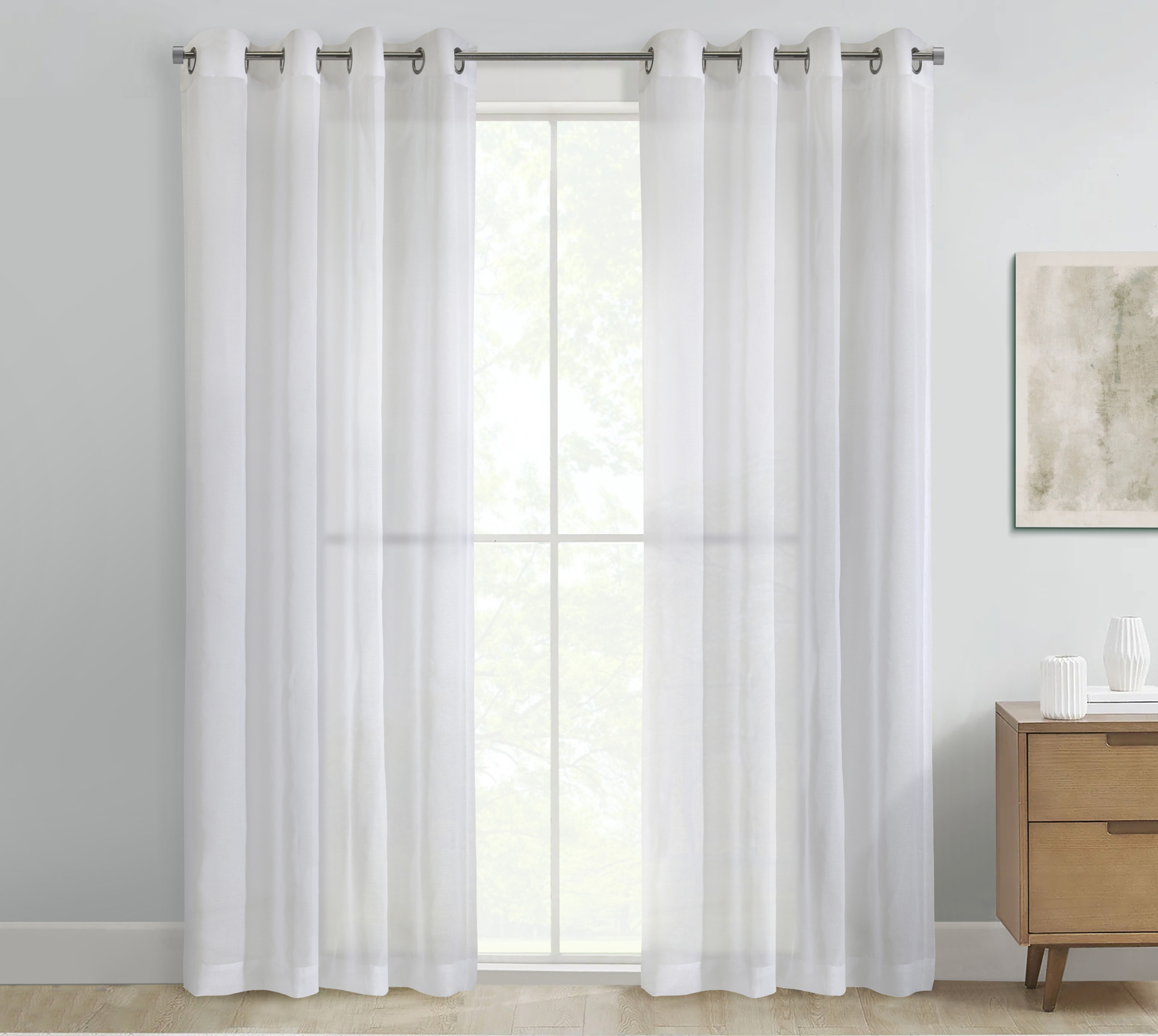 Daphne Sheer Curtain panels are the perfect accent for any room. It is designed with a delicate sheer texture, which drapes flawlessly and allows natural light to flow through the room, creating a sense of airiness and elegance. The grommets on the top make it easy to hang and install. It is made of long-lasting quality materials that are easy to clean. This curtain is sure to bring new life to any space, be it your living room, bedroom, or home office, thanks to its distinctive design and delightful texture. The sheer construction will allow light to enter your room, gently filtering natural light and allowing a modicum of privacy. The grommets in the header make this curtain simple to hang and glide open and closed effortlessly. Our curtains are all offered in various lengths to best suit your needs, ensuring we have the perfect curtain for any window size or style.