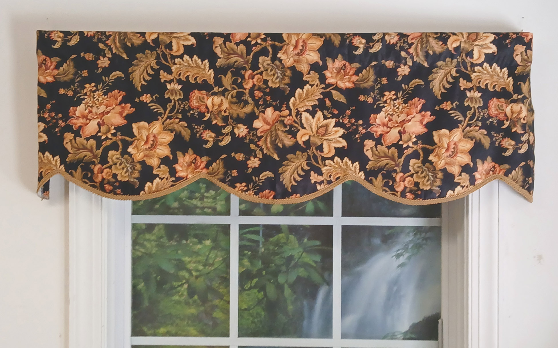 Made in America, Luxuriance Sapphire (Ebony) features a striking floral design of melon tones mixed with green and gold tones on a dramatic high quality black ground cloth.  This unlined cornice style valance features a 3 inch rod pock and no header.  Use a 2-1/2 inch wide continental rod for hanging.